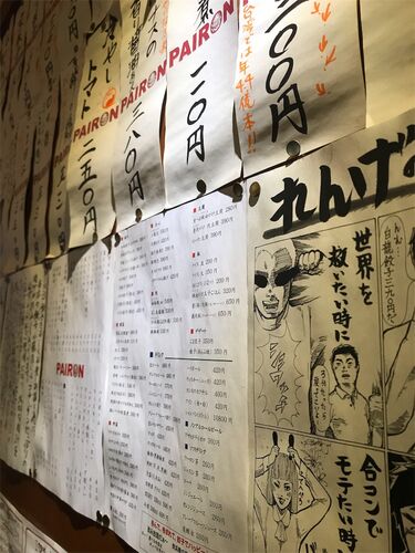 いつも美味しいものを見つけてくれる友人が連れてきてくれたこのお店は、飯田橋からかなり歩く、住宅街+オフィス街が混ざった場所にある。奇妙に分かれた入り口。門構えも、決して立派なものではない。 壁にはメニューがびっちりと貼られている。うーん、目…