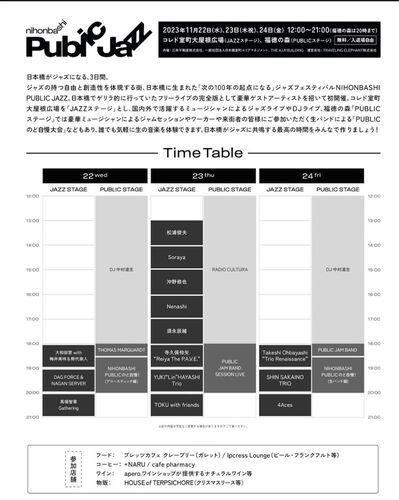 日本橋にて初のジャズイベント、NIHONBASHI PUBLIC JAZZ 2023に行ってきた。出演者リストで名前を知っていたのは、サックスの馬場智章氏(映画「Blue Giant」でサックス演奏をしていた)とTOKUさんくらいなのだが、TOKU with friendsの中にGiovanni Mirabass…