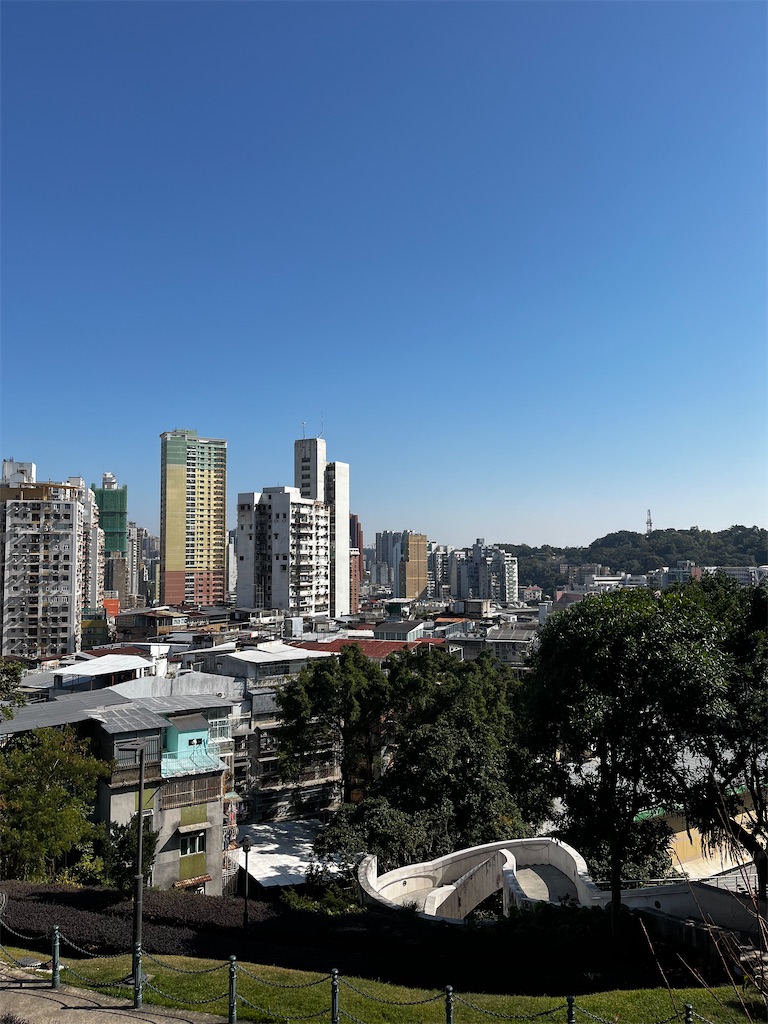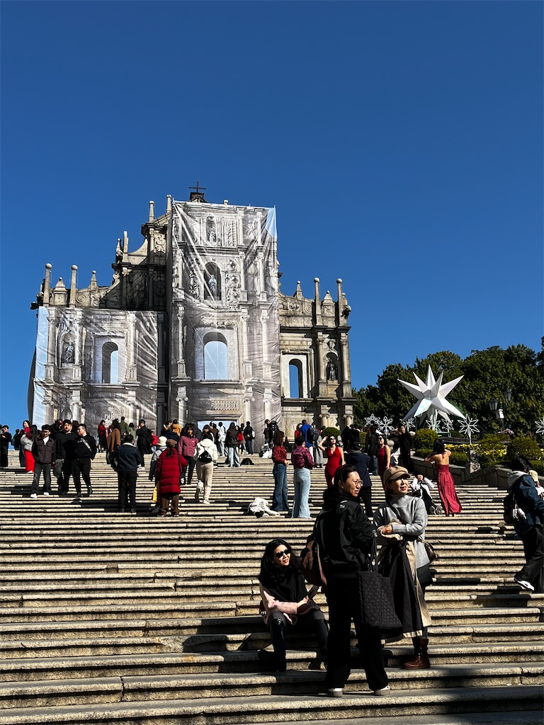 夕飯は、マカオで食べてもよかったのだが、なんとなく大きなホテル、ギャンブルエリアでの夕飯に魅力を感じなかったので、香港で食べることにした。というわけで、私のマカオ旅はここまで。最後に、私のツーリスト的写真を少々。聖ポール天主堂跡という一番有名な観光地が、まさかの修繕作業中だったのが、一番ショックだったな...。